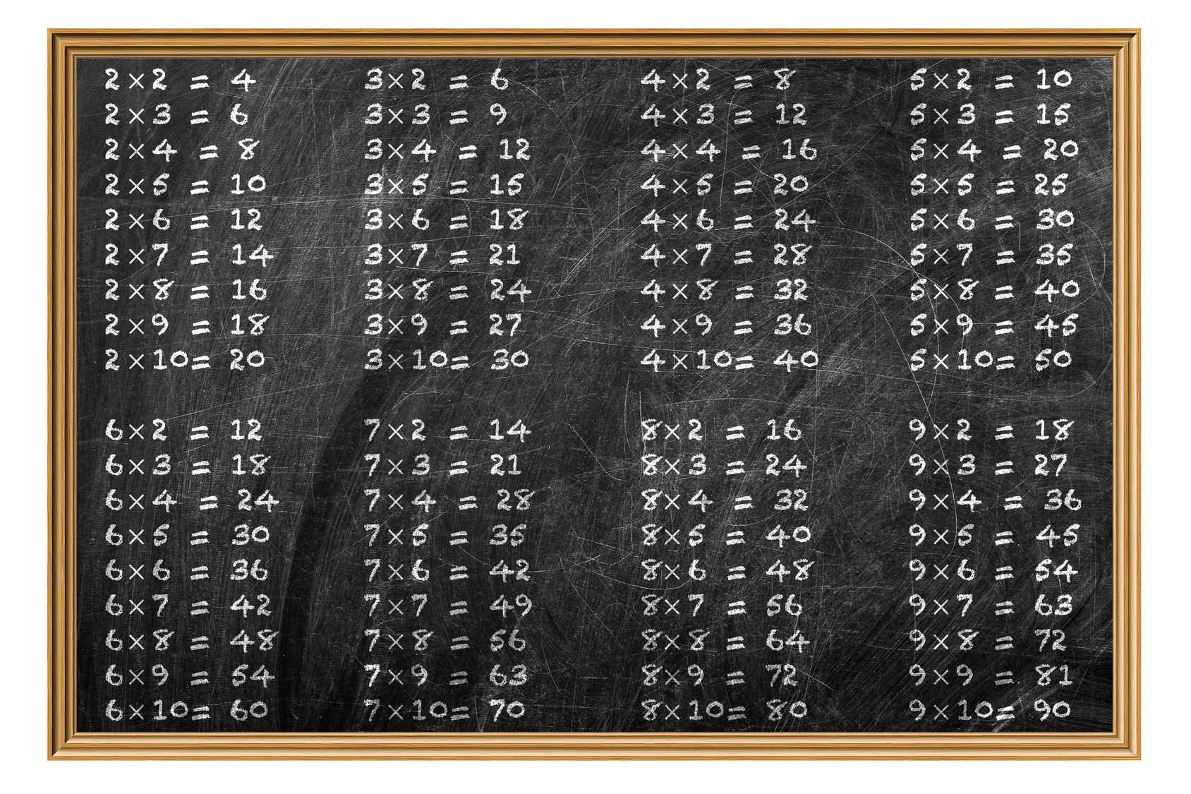 Multiplication table handwritten with white chalk on school blackboard on a wooden frame